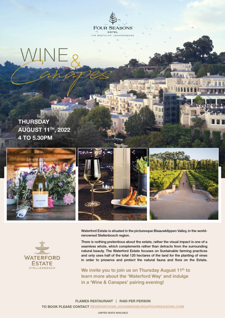 Join The Four Seasons Hotel The Westcliff, Johannesburg for a spectacular evening of wine and canapes hosted by Waterford Estate